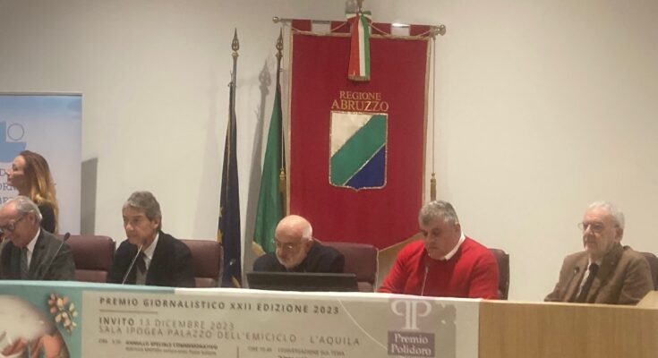 15 DICEMBRE 2023 – E’ una pubblicazione fotografica ad aver vinto la XXII edizione del premio “Guido Polidoro”, indetto dall’Ordine dei giornalisti d’Abruzzo e consegnato nella sala ipogea del Consiglio regionale in occasione della firma della “Carta di Pescasseroli” (nella foto il tavolo di presidenza, con, da sinistra, i presidenti degli Ordini d’Abruzzo, Stefano Pallotta, del Lazio, Guido D’Ubaldo, il Presidente del Parco Nazionale d’Abruzzo, Lazio e Molise, Giovanni Cannata, il Presidente dell’Ordine del Molise, Vincenzo Cimino). Autore della pubblicazione è Marinello Mastrogiuseppe, che ha raccolto e selezionato immagini su “Rievocazioni storiche e religiose nella provincia dell’Aquila”. Di una notevole parte di tali reportage Mastrogiuseppe ha allestito nella scorsa primavera una mostra presso la Confraternita di Santa Maria di Loreto. Pubblicheremo presto una antologia di foto, anche della Fontana del Vecchio detta il Vaschione, che Mastrogiuseppe con la sua consueta generosità ha regalato a questa testata.