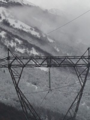 in questa foto che riprende un traliccio dell’alta tensione e un costone di montagna nei pressi di Pettorano sul Gizio, con la nebbia che agevola le incursioni dei lupi e delle volpi alle porte del paese. Sembra di vederla la fulva cugina del cane che, all’arrivo dell’ultima neve, come canta Branduardi: “Si è fermata là sull’altura, l’aria annusando indecisa”.