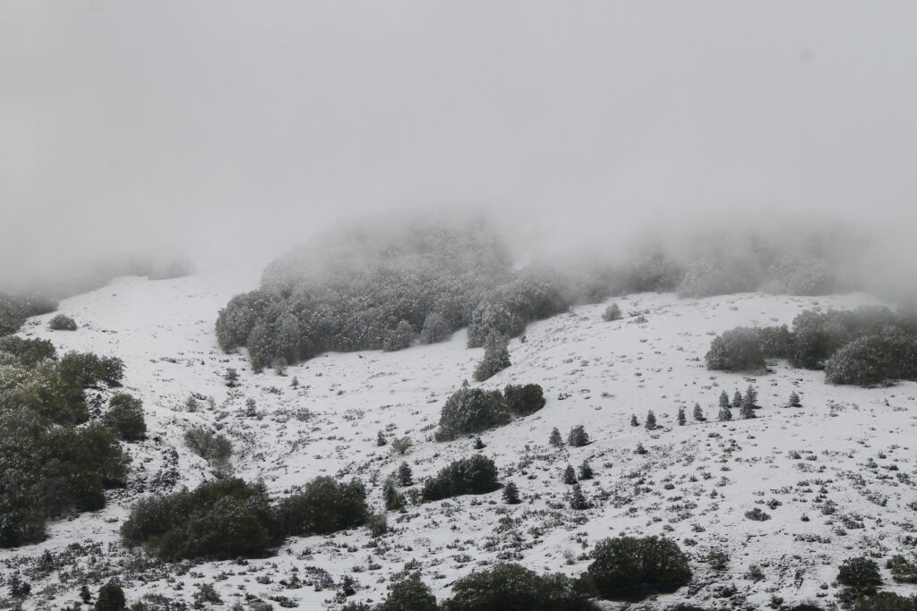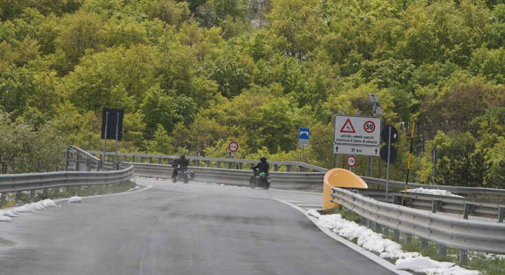 21 APRILE 2024 – Non si scompongono per il calo della temperatura questi baldi motociclisti che alle 13 di oggi viaggiavano sulla strada statale 17 da Roccapia alla galleria prima del Piano delle Cinque Miglia. A destra il bosco ha l’aspetto di un bosco di aprile. Ma a sinistra neve e nebbia mostrano il volto dell’inverno, che spinge i lupi agli ovili e all’occorrenza anche alle piazzole di sosta dei motociclisti. Per questo, forse, sfrecciano. E dopo la galleria, come molti, si butteranno a destra.
