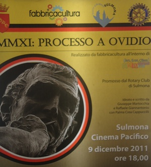 9 DICEMBRE 2011 – Colpo d’ala al processo contro il poeta Publio Ovidio Nasone (nella foto a sinistra: la locandina). La sua colpa è stata solo quella di rimanere libero dalle imposizioni del potere: quindi, l’aver sostenuto la successione al trono imperiale del grande Romano, quel Germanico che era espressione della “gens julia”, in luogo di Tiberio che, esponente della “gens claudia”, era stato designato sostanzialmente da Livia Drusilla, moglie dell’imperatore Augusto. Per questo una giuria, convocata al cinema Pacifico al termine dell’allestimento di un dramma che rievocava le ultime ore di Ovidio a Roma, ha revocato il decreto di relegazione del Vate da Roma a Tomi. Il presidente del “collegio”, il dott. Franco Cavallone, ha detto che la decisione sarebbe andata oltre e al di sopra delle esigenze formali e dei passaggi stretti della procedura. In effetti, se si vuol essere legulei, la revoca del decreto di Augusto avrebbe potuto assumerla solo Augusto o un suo successore dell’anno 2011, purchè avesse le insegne e il potere di un imperatore romano, cioè di un pari grado di Obama e Putin messi insieme, visto che Roma, a suo tempo, era la massima espressione di tutto il mondo evoluto conosciuto sul pianeta.