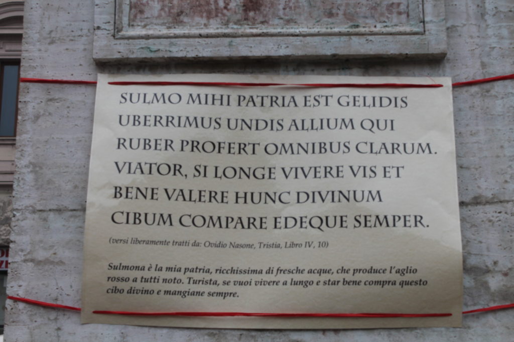 Poteva andare peggio se a intitolare l'”open day” fosse stato lo stesso latinista che scrisse l’ignobile cartello sotto la statua di Ovidio (nell’altra foto) con lo stravolgimento dei “Tristia” e la declinazione di “allium qui ruber” (come se il neutro di “rosso” fosse “ruber” e non “rubrum”). Certamente il designato del sindaco a dirigere il Museo, davanti a simile scempio, s’offrirà ancora molto.