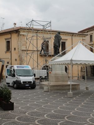 E, come suggeriamo in altro articolo, deve essere apparso in sogno a Iezzi folgorandolo con un esametro. Ma questa sotterranea vendetta che si consuma da oggi fino a domenica non è encomiabile, soprattutto perchè colpisce un uomo di cultura. In pratica, la statua di Ovidio è stata sovrastata da una torre (nella foto mattutina quando era ancora in edificazione e non era brutta come è adesso) e, all’altro fianco, da uno stand da sagra paesana, in modo che chi passa si potrà chiedere se quello che sta sul basamento di pietra sia un operaio della ditta capitato lì per caso in attesa di montare un tubo Innocenti, magari un po’ pensoso perchè non arriva ancora lo stipendio.