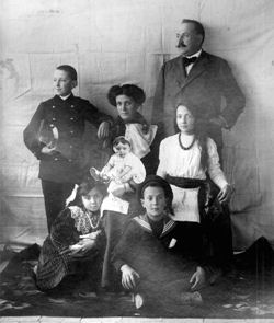 Fa parte della storia di Pratola Peligna questo aneddoto dell’inizio del Novecento (1915, per la precisione), quando vediamo la sua famiglia al gran completo. La moglie, Matilde Graziani, tiene in braccio l’ultimo arrivato, Franz, che diventò poi generale dei Carabinieri e che sposò Amelia De Prospero. Matilde, figlia di Amelia, l’ha cortesemente concessa al Vaschione. Gli altri sono, da sinistra: Gino, Dora, Antonino, Ines.