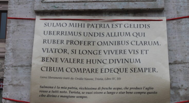 Nella foto del titolo, il cartello che cercò di trasformare Ovidio in testimonial dell’aglio. Furono la Direttrice del Polo Museale d’Abruzzo, Lucia Arbace, il presidente dell’Archeclub di Sulmona, privati cittadini e Il Vaschione (che si rivolse al Tribunale) a sollevarsi per questa indecente pagliacciata, animata dalla smania di vendere con un collegamento al “marchio forte” di Ovidio nel mondo. Sindaco, altre associazioni, Raffaele Giannantonio, oggi consulente scientifico del museo di Ovidio, diventarono poliglotti tacendo in sette lingue, compreso il latino.