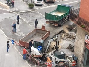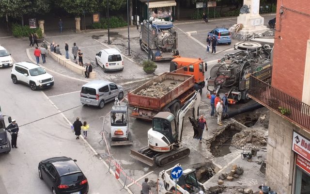9 MAGGIO 2018 – Stridore di ferri; battito di percussori; scuotimento delle falde: per tutta la giornata la SACA è intervenuta in Piazza Tresca, inondata ieri da liquami irripetibili. Di un tombino la società guidata da Di Loreto ha fatto una stazione di metropolitana. Anche in questo Sulmona sorpasserà L’Aquila, che prima del terremoto si è inventata la “metropolitana di superficie” (contraddizione in termini che solo alle falde del Gran Sasso consente di spolpare l’Italia di risorse che sarebbero destinate alle cose serie) mai entrata in funzione.