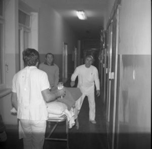 La lettiga con il rapinatore appena sbarcato dall’ambulanza si avvia in sala operatoria