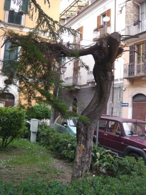 Una mano premurosa lo legò con un doppio passaggio di corda ad un abete fortissimo e dritto che lo distanziava di cinque metri circa. Un poco alla volta, forse in dieci anni, quell’albero di legno nodoso e testardo aveva ripreso a camminare verso il cielo, senza distrarsi sul balcone della casa all’angolo con Via Corfinio.