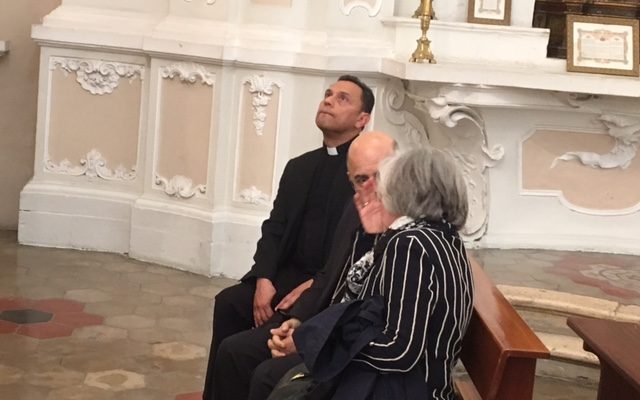 14 MAGGIO 2017 – E’ stata dura combattere con i mille incastri della burocrazia; ma alla fine nulla è difficile per chi vuole e don Gilberto (nella foto all’interno di San Francesco della Scarpa) presenta al Vescovo il restauro dell’antico affresco forse attribuibile al de Litio, ma sicuramente realizzato perché tutti indistintamente fruissero e fruiscano dei contenuti spirituali profondamente incisi nel dipinto.