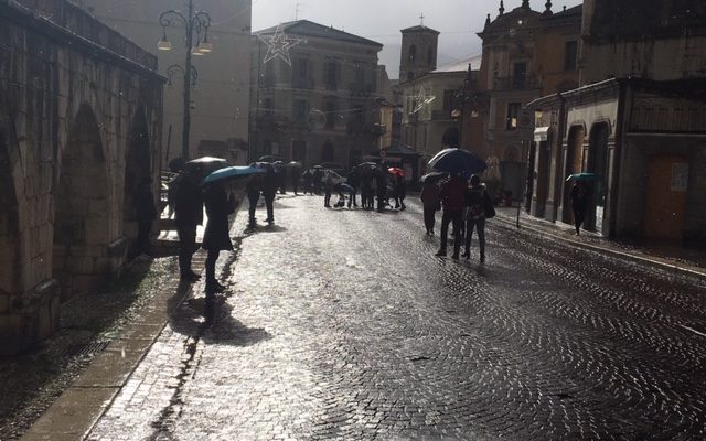 27 DICEMBRE 2019 – Gelo e neve si prevedeva per questa notte; poi le previsioni, che non sono mai assolute, hanno spostato più in là il vento di Burian e forse qualche fiocco, se verrà, imbiancherà solo la giornata di domenica. Quello che c’è da godersi è il sole che improvvisamente esce tra le nuvole, come ieri l’altro, quando lungo il Corso, prima di Piazza Carmine, si vedevano i riflessi degli ombrelli e del porfido lucidati (nella foto del titolo), come si fosse il dopo di una allegra giornata estiva e la gallina fosse pronta a tornare in su la via.