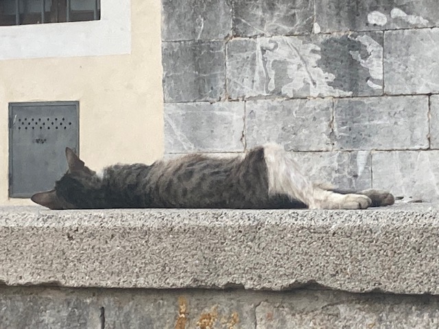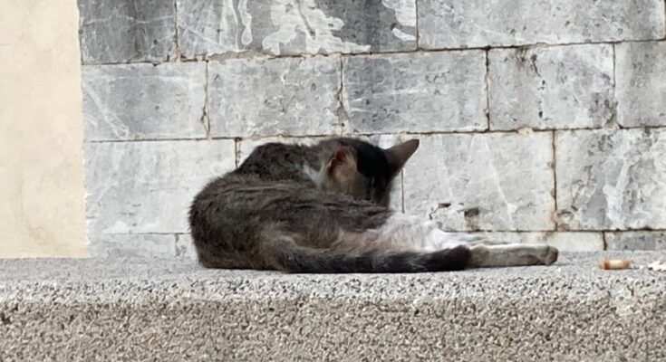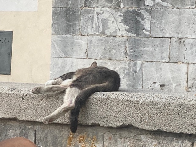 6 LUGLIO 2022 – Il gatto che (nella foto del titolo) fa toilette sulla pietra di San Filippo Neri in Piazza Garibaldi si gode gli effluvi di cucina del ristorante, ma dopo un po’ si distende (foto qui accanto) perchè il caldo l’opprime.