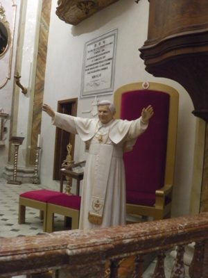 E’ proprio lui, anche se in statua: Joseph Ratzinger, della stessa altezza, con lo stesso sorriso contenuto. Santa Chiara ha il fascino dei luoghi che si visitano poco; i sulmonesi, quelli di una certa età, la ricordano come sede degli scouts, i meno giovani per la pallacanestro di Sor Ignazio; i più giovani non sanno neppure che esista. Pur rimessa a nuovo una trentina di anni fa, dopo essere stata chiusa per decenni (e aperta solo nel tetto, sfondato), è inaccessibile in ogni mese dell’anno; ed oggi è il luogo per ricordare che questa città ha accolto in una calda giornata di luglio il papa che stava per compiere la grande rinuncia. Per chi si era affezionato all’uomo così dotto e così mite nelle espressioni di contatto con la folla, schivo e pertanto sospettato di preferire il distacco, Santa Chiara serve a confermare che quella unica messa in quasi mille anni dalla precedente non è una sedimentazione onirica: ci sono i calici che Benedetto XVI ha donato al vescovo di Sulmona, l’”evangellario” che gli servì a leggere la parola del Dio che stava per invitarlo a lasciare il soglio. E poi ci sono tante, tantissime fotografie della Piazza Garibaldi festosa (ma non troppo), un riproduttore di dvd pronto ad essere telecomandato per chi volesse riproiettarsi indietro e leggere quali siano stati i segnali lanciati dal Papa a Sulmona due anni e mezzo prima di rinunciare.