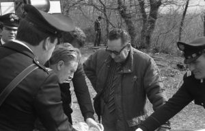 Il figlio della coppia di artigiani rimasti uccisi mentre parla con il vice-questore Vincenzo Pinto (sulla sinistra) e i Carabinieri