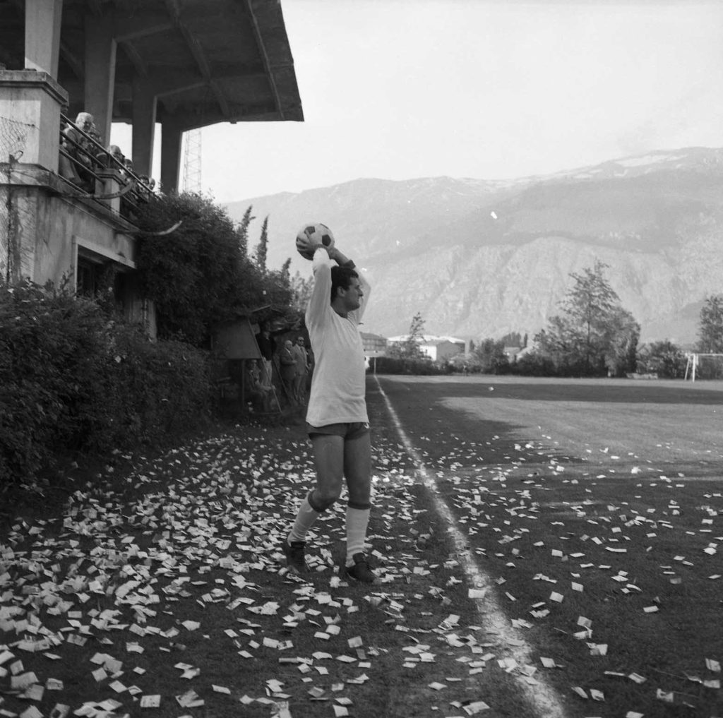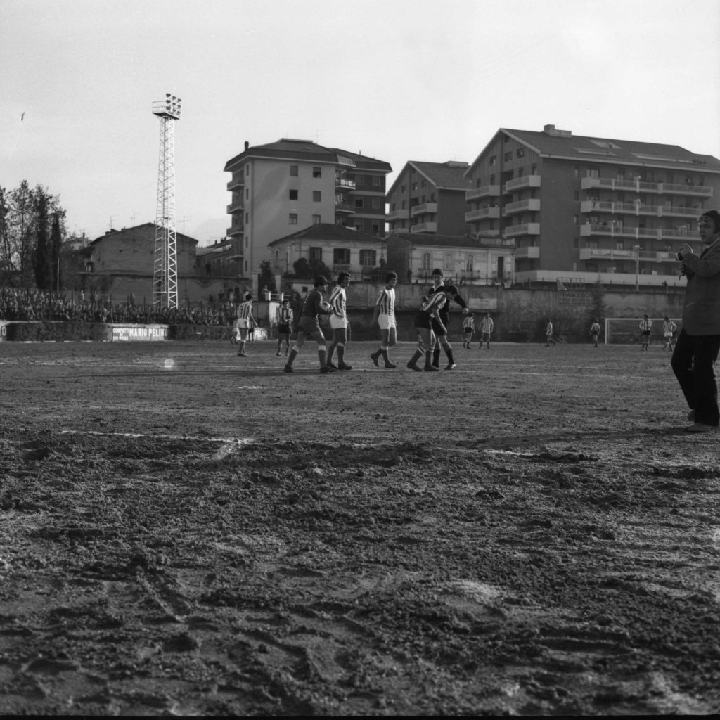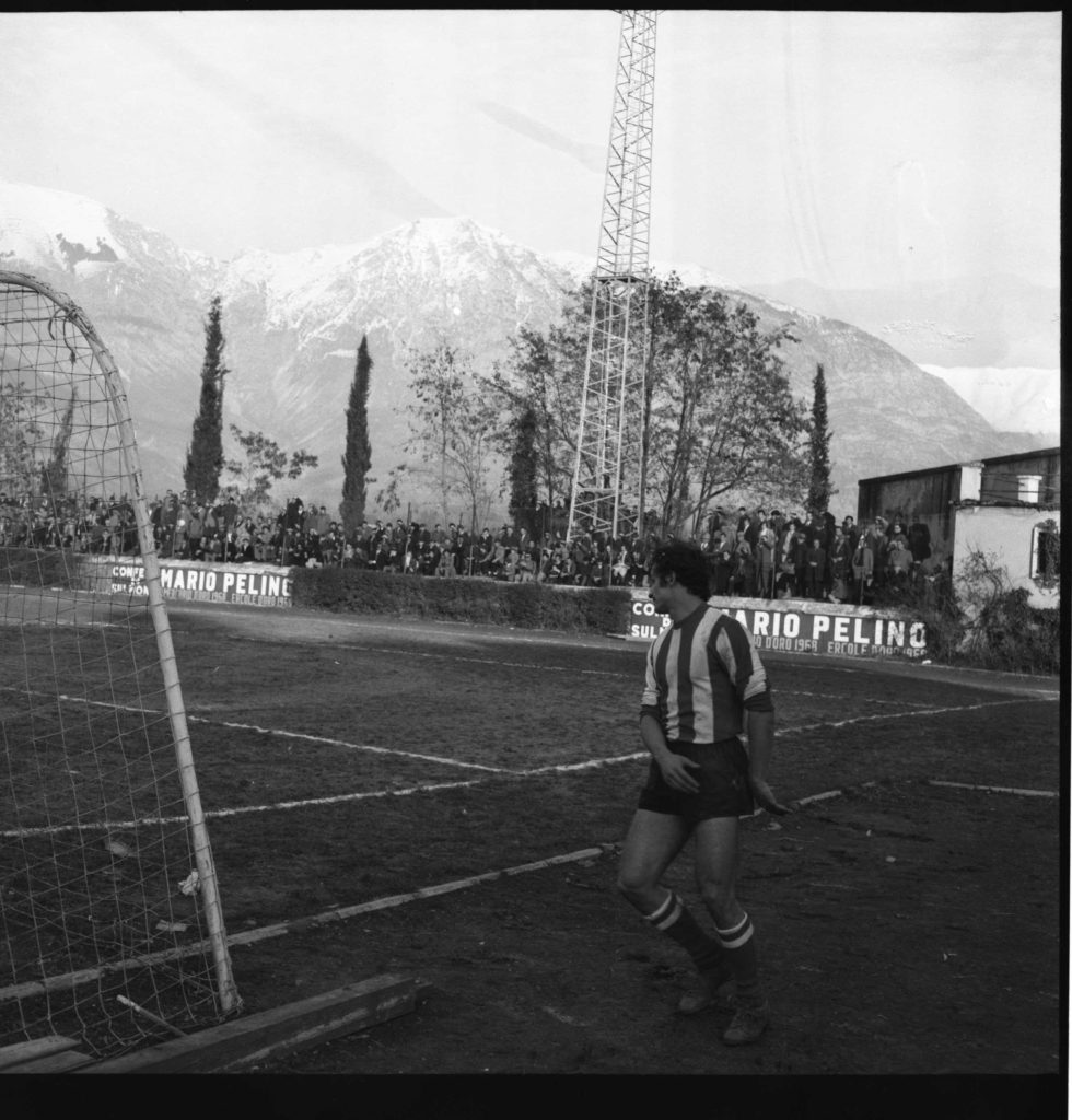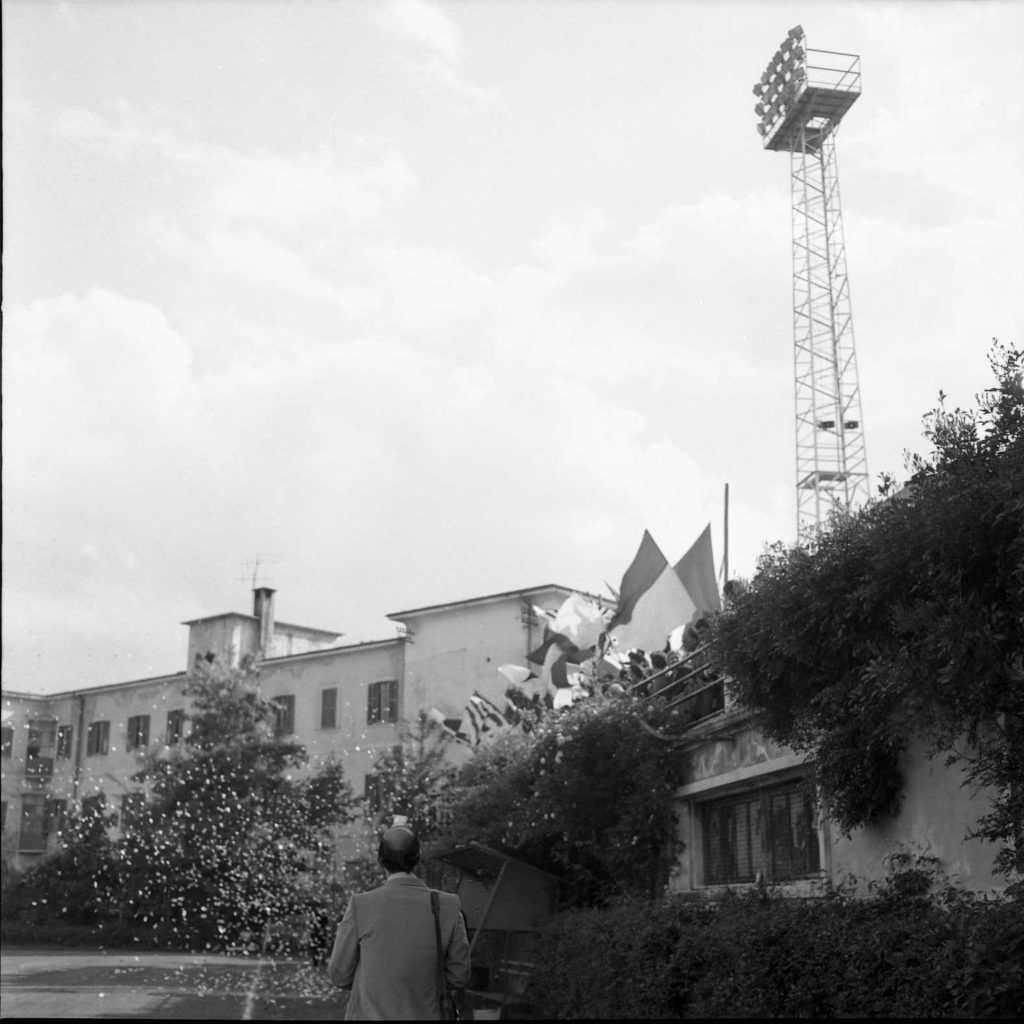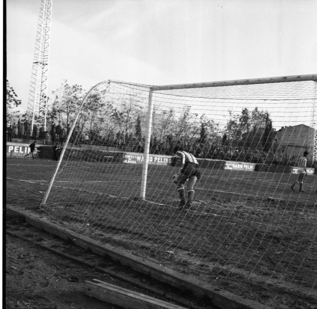 Nella foto del titolo il viso affaticato, ma soddisfatto di Giuseppe Silenzi dopo il gol, mentre riceve l’abbraccio dei compagni di squadra sotto la tribuna. E, nell’altra foto, mentre la tribuna esulta.