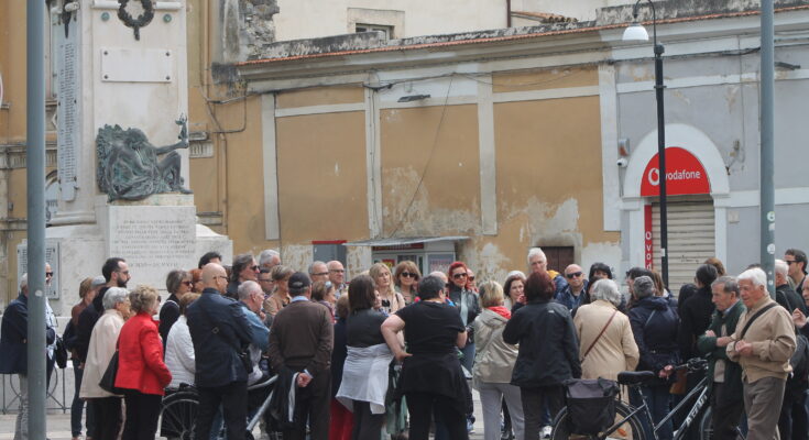 Il meno del meno. E non per colpa dei terremoti, che hanno, invece, dissipato i fulgori artistici di tante chiese e palazzi di religiosi. Durante il tour organizzato dall’Archeoclub domenica scorsa, intitolato proprio alle chiese scomparse, è stato fatto un riferimento preciso alla Chiesa di Sant’Agostino, che si affacciava sulla attuale Piazza Tresca, dove adesso sorge un negozio di telefoni (nella foto del titolo il gruppo di visitatori). E’ rimasta solo una apertura (poi chiusa) monofora, attaccata al palazzo della famiglia Capograssi (nella foto).