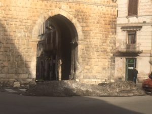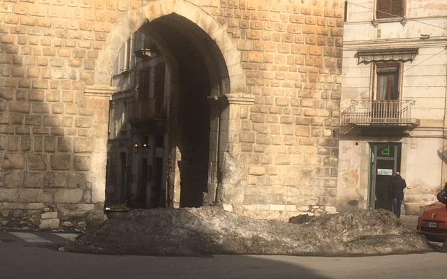 17 GENNAIO 2019 – Davanti al primo dei monumenti che si incontrano provenendo da Napoli, la porta omonima a sud della città, il Comune lascia sciogliere un cumulo immondo di neve nera che più sta e più si annerisce. La porta in sè non ha bisogno di abbellimenti, basterebbe proporla così com’è perchè sta lì dal XV secolo. E invece…