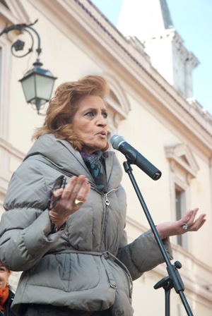 Paola Pelino mentre proclama in Piazza XX Settembre il suo impegno per il tribunale (dopo averlo soppresso)