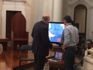 Paolo Cui (a destra) mentre illustra al Vescovo l’importante restauro dell’affresco della Madonna del Latte a San Francesco della Scarpa