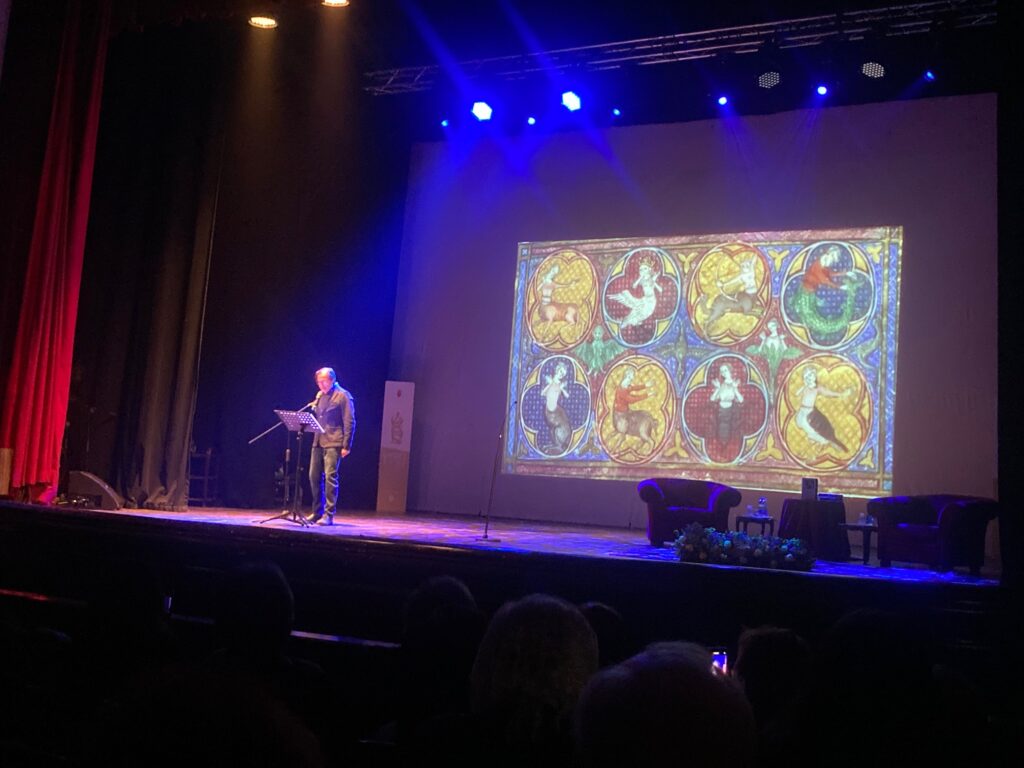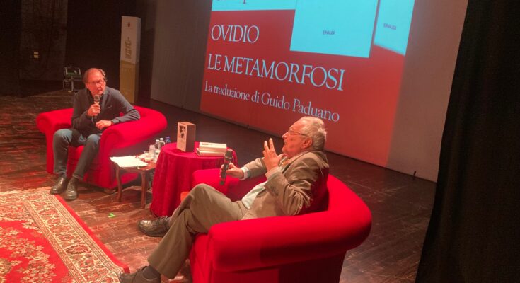 Il sospetto che a silenziare l’austero teatro vellutato sia stata la dirompente forza descrittiva di Ovidio va coltivato. Un po’ perché la lettura di Mario Massari (nella foto del titolo mentre colloquia con il prof. Guido Paduano, autore della traduzione) è stata davvero magnetica; un po’ perché la scelta dell’episodio della ninfa Callisto e dei primi versi sulla creazione del mondo è stata molto adeguata all’atmosfera che immancabilmente il teatro ha disegnato.
