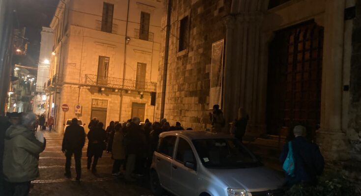 15 DICEMBRE 2022 – Una volenterosa guida turistica intrattiene volenterosi turisti che intendono conoscere di più della facciata di San Francesco della Scarpa, in Via Mazara. Ma proprio a venti metri dal palazzo comunale è buio pesto. Si vedono solo i profili dei turisti. La guida racconta anche le caratteristiche del portone di castagno, finemente lavorato da artigiano di Capestrano (“il paese che avrete notato venendo dall’Aquila“). Non riesce, però, ad evocare la suggestione dell’affresco da poco restaurato: quello della “Madonna del latte”, cioè la poesia del dono della Madre davanti a San Francesco e Santa Chiara. Qualche turista, affascinato dal disegno del portale, pure esso recuperato con un restauro di tre anni fa e dalla purezza della pietra della Majella, chiede se di giorno si potrà vedere la Chiesa. Certo che sì; ma da qualche secolo sono stati inventati i lampioni.