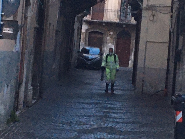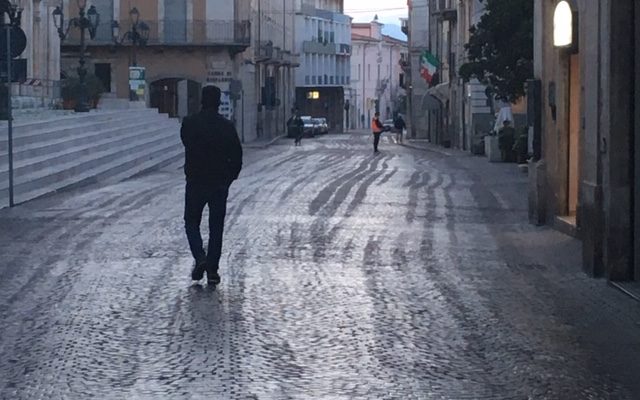 17 MARZO 2020 – Grigio perla è il porfido del Corso che riflette le ultime luci del giorno che precede, forse, il picco del contagio da coronavirus; silenzio irreale che le immagini non possono trasmettere, ma atmosfera che è contenuta tutta nei riflessi, nell’attraversamento di un solitario passante, nei colori spenti della bandiera, mentre la città viene disinfettata e dopo un lungo periodo di siccità quel porfido è lucido come se l’avesse accarezzato la pioggia sottile di marzo. De Filippo direbbe che deve passare la nottata; e per questo Sulmona si prepara a passare la nottata.
