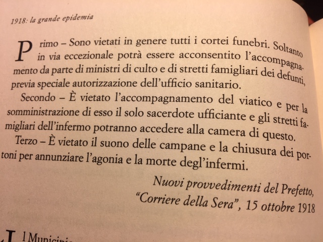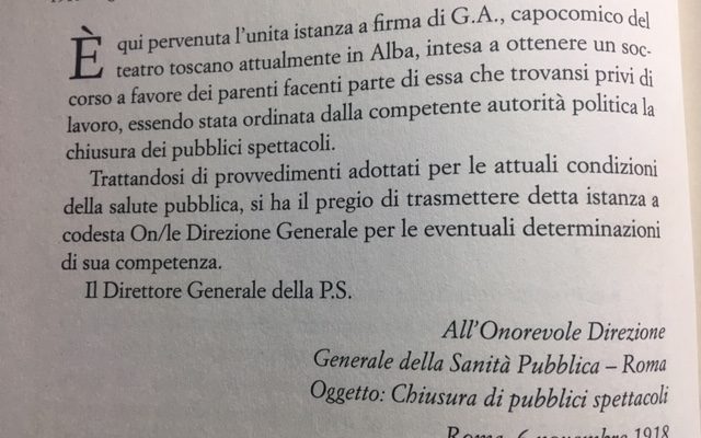 30 MARZO 2020 – Riccardo Chiaberge, con il suo “La grande epidemia”, edito da UTET (2016, pagg. 1-234, EURO 16,00) e dedicato alla “Spagnola” del 1918/1919, ha raccolto tanti documenti che forse neanche lui avrebbe pensato si potessero trovare attuali un secolo dopo: come questa burocratica nota (foto del titolo) inviata alla Direzione generale della Sanità pubblica per una piccola compagnia di teatranti che era rimasta priva di ogni fonte di sostentamento. Si notano i toni supplichevoli, struggenti a tratti, seppure sommersi dal burocratese di quella che fu chiamata l’Italietta dei buoni sentimenti dopo il disastro mondiale della guerra. Certo, dopo 100 anni si può fare il confronto con l’arroganza delle affermazioni del sindaco dell’Aquila, Biondi, che proprio oggi strologava sulla necessità che i fondi elargiti dal governo per le provvidenze del coronavirus non si sostituiscano a quelli dei quali beneficiano già i reduci da altre calamità. In sostanza, dal capoluogo abruzzese si pretende di chiarire, forse con un decreto legge, che se i teatranti aquilani ricevono un sussidio per il terremoto (un po’ come le tasse sulla benzina per il terremoto del Belice del 1968 che si pagano ancora) non per questo debbono rinunciare al sussidio per il coronavirus.
