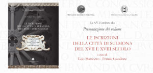 7 MAGGIO 2019 – Il secondo volume sulle “Iscrizioni della città di Sulmona”, quello relativo ai reperti del XVII e XVIII secolo”, è stato presentato ieri nell’aula “San Panfilo” dell’ex seminario diocesano in Via Roosevelt alla presenza degli autori, Ezio Mattiocco e Franco Cavallone per iniziativa della Università della Libera Età.
