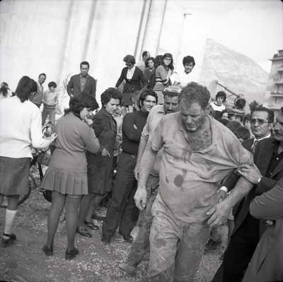 Verso le ore 14 di un giorno di metà settembre del 1972 un operaio tra i cinque o sei che si avvicendavano nella piccola trincea realizzata con una ruspa fu letteralmente sepolto e rimase per un bel po’ sotto terra. Concitazione, richiesta disperata di aiuto, timore di azionare la pala meccanica per non far del male al malcapitato: c’era di tutto sotto gli occhi dei curiosi che si andavano assiepando. Con un po’ di calma, riconquistata dopo lo sgomento, gli altri operai cominciarono a scavare con le mani e furono aiutati dal fatto che la trincea era stretta e non molto lunga. Poi, del “resuscitato” (nella foto del titolo) si videro un braccio, una gamba, la testa: aveva solo escoriazioni e finì di alzarsi da solo, tutto dello stesso color terra. Ma la vita continuava e a tirare il maggior sospiro di sollievo fu il titolare dell’impresa di costruzioni, che aveva seguito tutte le operazioni con il volto tirato e, anch’esso, terreo.