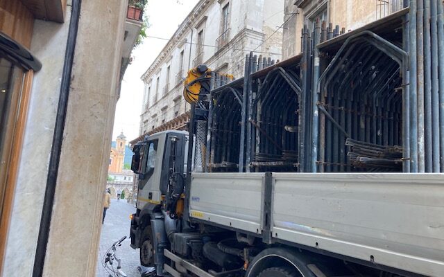 24 MAGGIO 2021 – Uno vede un TIR di ponteggi davanti a Palazzo Pretorio e pensa che sia arrivata l’ora del restauro, dopo dodici anni di abbandono. Invece il camion porta i ponteggi per imbiancare la facciata del palazzo verso la Chiesa di San Francesco. Un vernissage a qualche mese dalle elezioni, o, come si dice a Roma, una romanella, una imbiancata alla buona, per far vedere ai nuovi inquilini che qualcosa s’è fatto (all’apparenza).