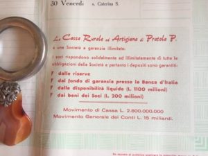 Fu un sollievo perchè sulla Cassa Rurale avevano sperato persone di assoluta concretezza, di quelle che mettono da parte lira su lira senza contare su nessun aiuto di Stato e senza fare affidamento su nessuna forma di previdenza sociale; tanto che la formula “a responsabilità illimitata” era l’argomento per convincere la clientela a depositare risparmi sudati. Quando la Cassa Rurale stampava (nella tipografia Ars Grafica Vivarelli, per sostenere le imprese locali) i calendari degli anni Sessanta, i soci rispondevano con tutto il loro patrimonio per le obbligazioni sociali. Partecipando alle riunioni assembleari che si tenevano nell’attuale salone del consiglio di amministrazione, in quegli anni nei quali i soci erano 150 o giù di lì, non ero del tutto sicuro che si rendessero conto di quanto rischiassero. Ma siccome con loro rischiava pure “Don Guido”…