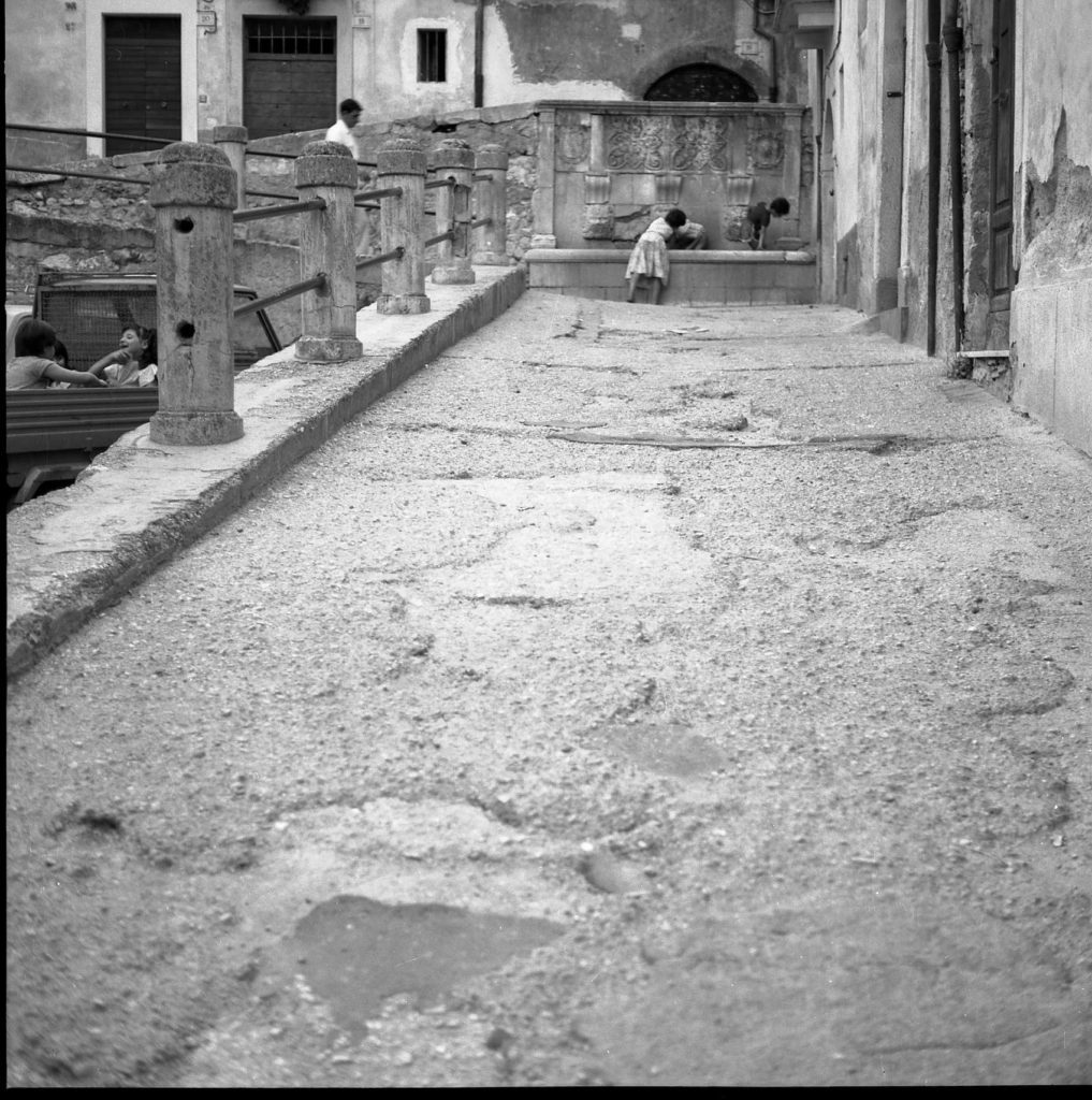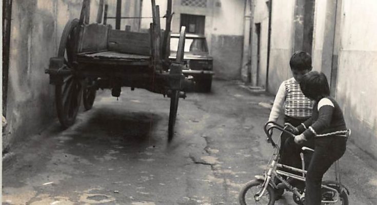 13 APRILE 2020 – Questa foto di tanti anni fa (45) faceva parte di un reportage sulle condizioni della viabilità cittadina; e infatti l’obiettivo è centrato in un vicolo che delimita la chiesa di San Gaetano, a Via Marco Barbato. Come spesso accade per le fotografie che invecchiano e non dicono molto perchè i temi di stretta attualità non sono duraturi (“per la ragion che nol consente”, visto che sono di attualità), inaspettatamente si avvertono altre chiavi di lettura, decentrate dall’obiettivo. E, sotto questo profilo, si notano due bambini che giocano con una minuscola bicicletta, magari alternandosi alla guida, accanto ad un carretto per il traino animale e con lo sfondo una NSU Prinz, che spopolava tra le utilitarie del periodo. L’altra foto fu scattata nella stessa epoca davanti alla FOntana di Sant’Agato, quindi nel “Borgo pacentrano”. Una fanciulla è protesa verso la maschera della fontana (porta un’ampia gonna, che non si usa più per esigenze di abbigliamento unisex). Accanto un ragazzino forse della sua età. Non lontano da loro, a sinistra, seminascosti dalla balaustra, altri tre ragazzini se la ridono dentro il cassone di un’Ape, cioè nel più improbabile dei mezzi di trasporto. Forse aspettano qualcuno che li scorrazzi o si sono seduti per fare un po’ di… salotto. A capitare adesso nella stessa zona si ha l’idea della desertificazione e non già per le implicazioni da coronavirus, perchè di ragazzini intenti a giocare per strada si è persa traccia da molti anni, per la denatalità e per l’attrattiva mielosa degli smart-phone, che non richiedono nessuna avventura nella realtà di una fontana o di un giro da luna-park sulla Piaggio da passeggio.