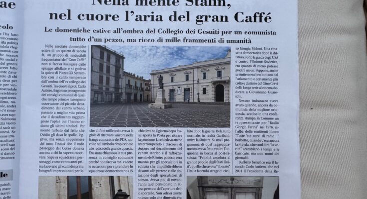 8 AGOSTO 2025 – Nel silenzio della piazza di adesso echeggiano le parole sussurrate dai protagonisti di un tempo, anche recente. Sono quelle di un comunista irriducibile, ma non trinariciuto, raro esempio di consapevole critico di se stesso, tanto da vivere contrasti laceranti tra l’essere e il dover essere. C’è una pagina che racconta di Carlo Autiero nel “Vaschione” in edicola da oggi e in distribuzione gratuita, senza un rigo di pubblicità, testata libera da “servo encomio”, tanto più da “codardo oltraggio”. Raccontiamo anche di quando l’Autiero comunista mal sopportò ad una conferenza stampa il giornalista che, da direttore della prima testata radiofonica, nel 1976, mandammo a Palazzo San Francesco in pieno periodo di amministrazione social-comunista, per riportare, come sempre, la voce di tutti (esercizio in progressivo restringimento all’epoca dei social e dei giornalisti asserviti alle esigenze pubblicitarie di avvocati penalisti che spifferano le peggiori accuse sui propri clienti prima che i processi si facciano, oppure sbandierano successi da pallonari).
